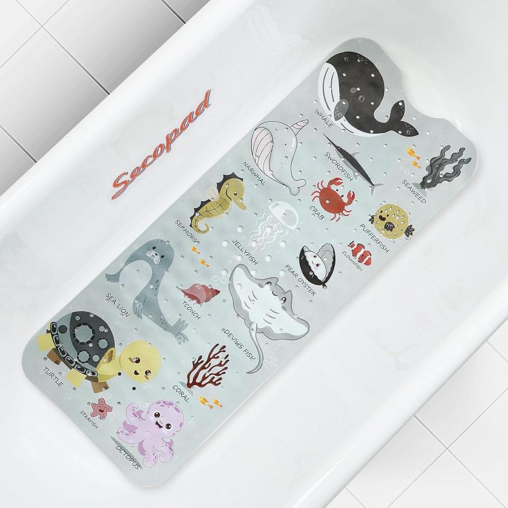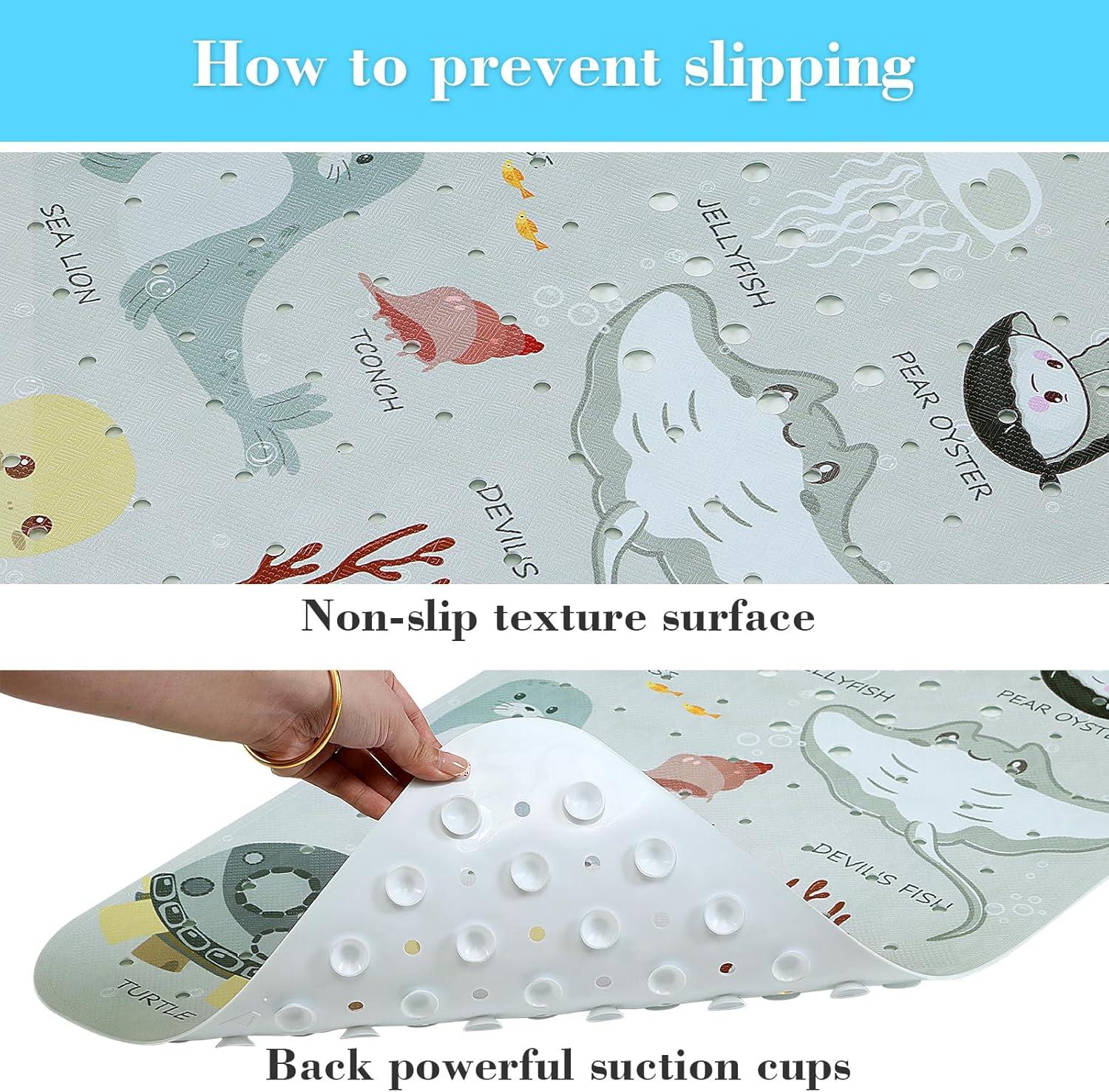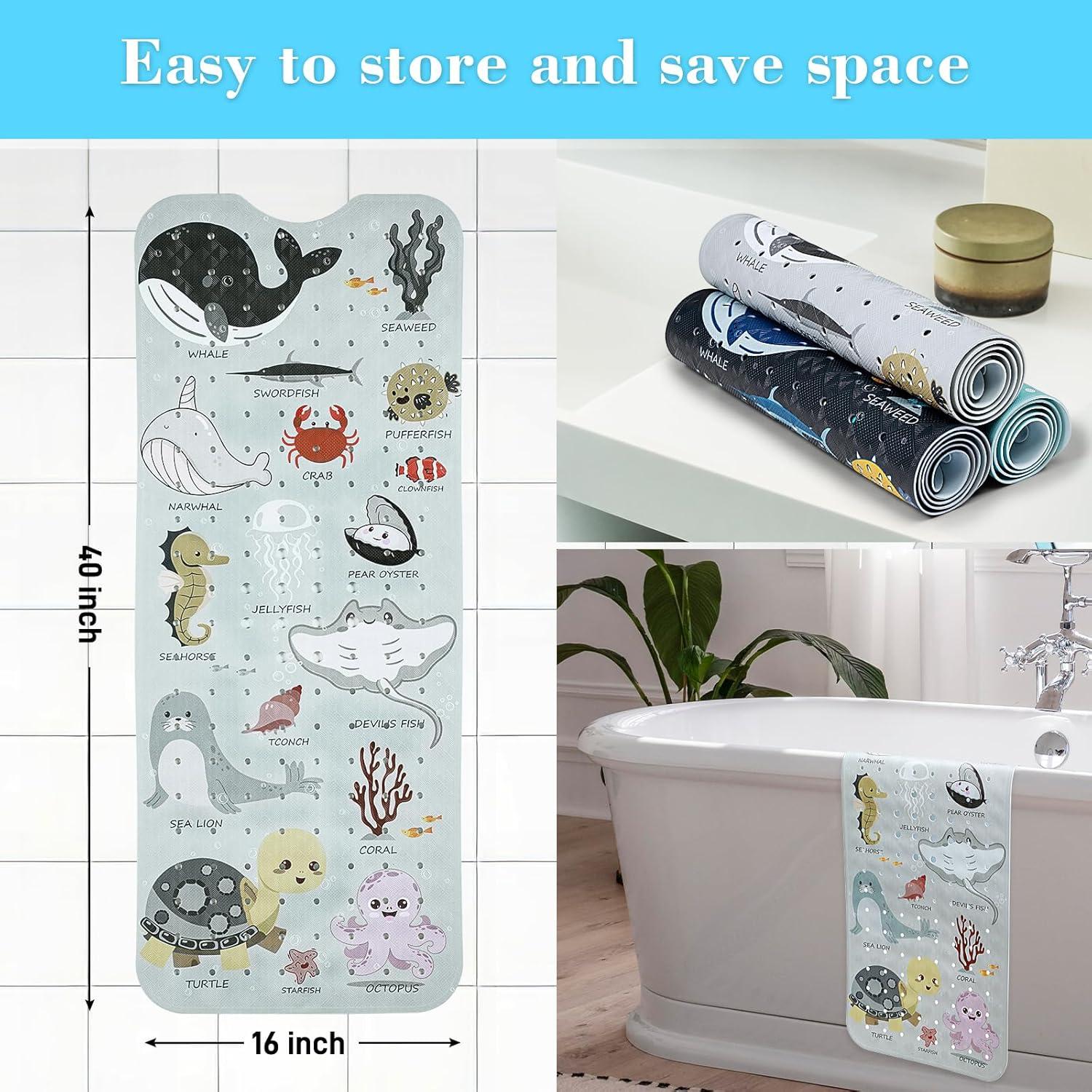 Baby Bath Mat, Cartoon Kids Bathtub Mat Non Slip for Toddler Bath Shower Anti Slip, 40In X 16In with Drain Holes and Suction Cups Machine Washable, Pink Sea Animals(Blue Sea Animals)