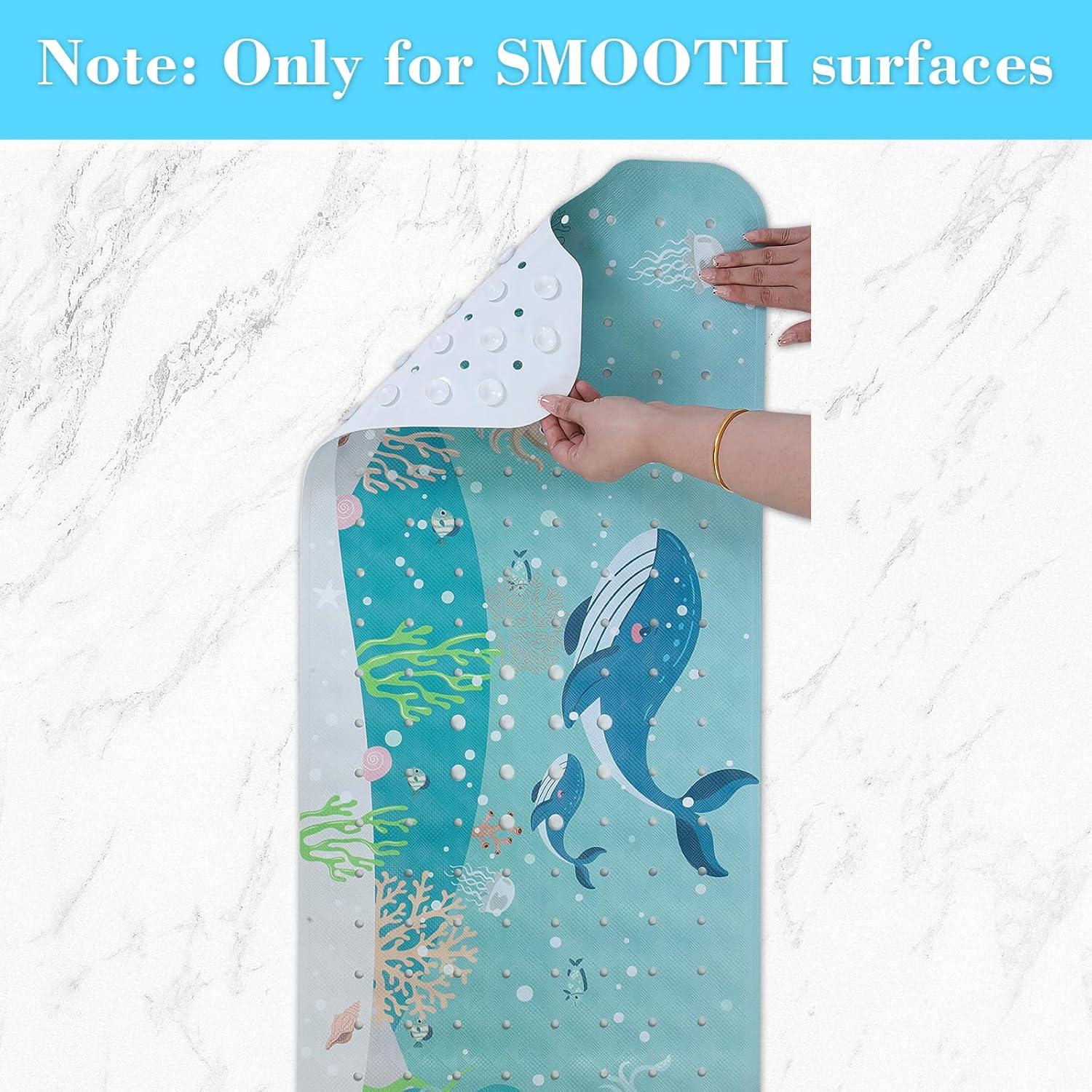 Cartoon design & Large size: The cartoon patterns on the bath mat for tub non slip would make your kids will enjoy bathing time and the size is 40inch X 16 inch, it will fit the bath tub correctly