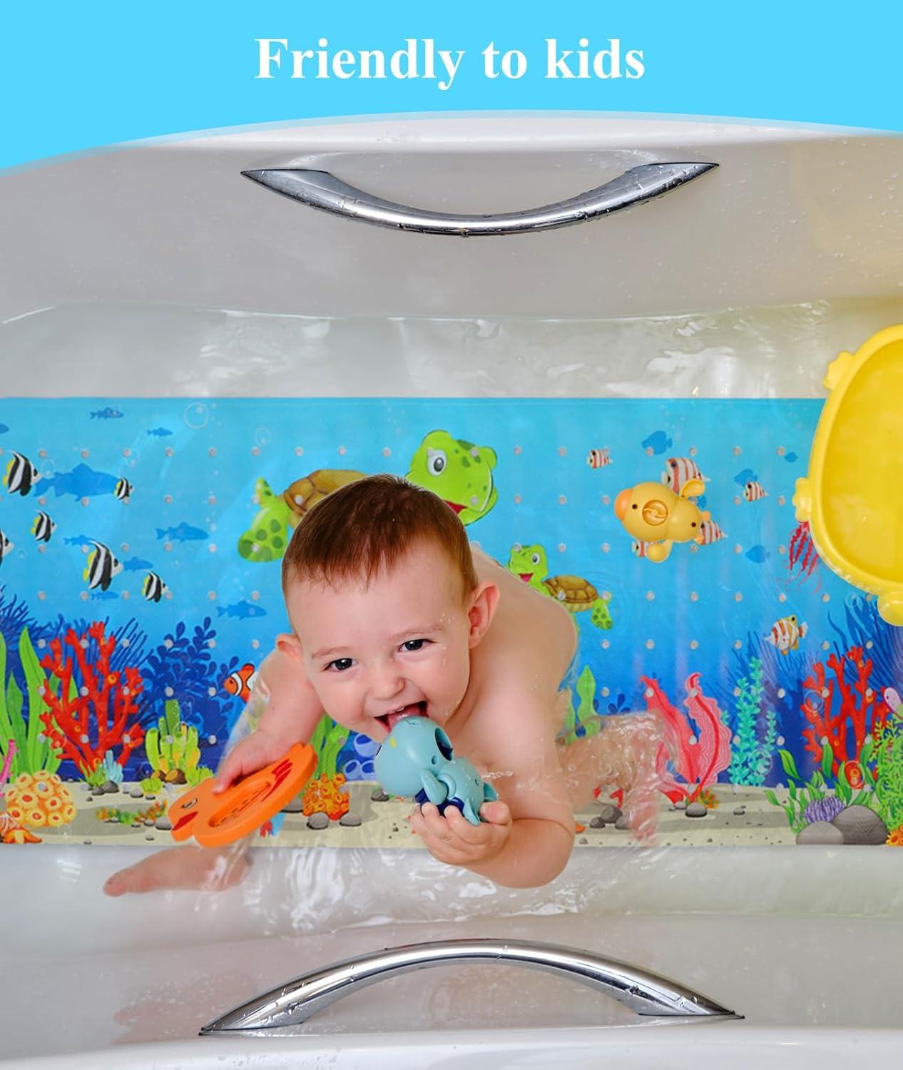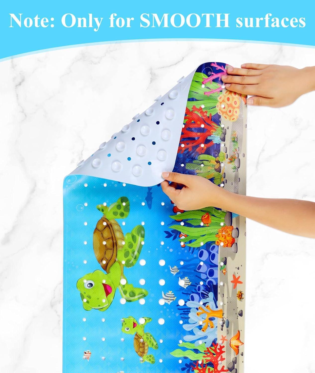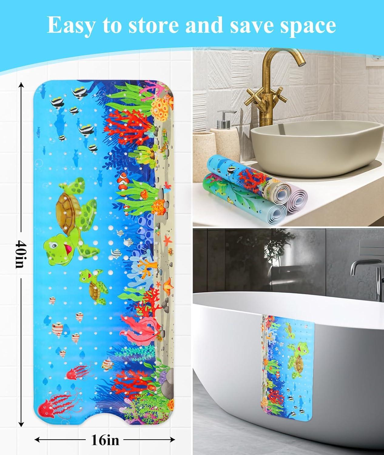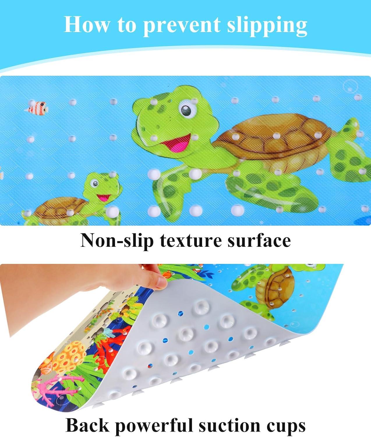 Cartoon design & Large size: The cartoon patterns on the bath mat for tub non slip would make your kids will enjoy bathing time and the size is 40inch X 16 inch, it will fit the bath tub correctly